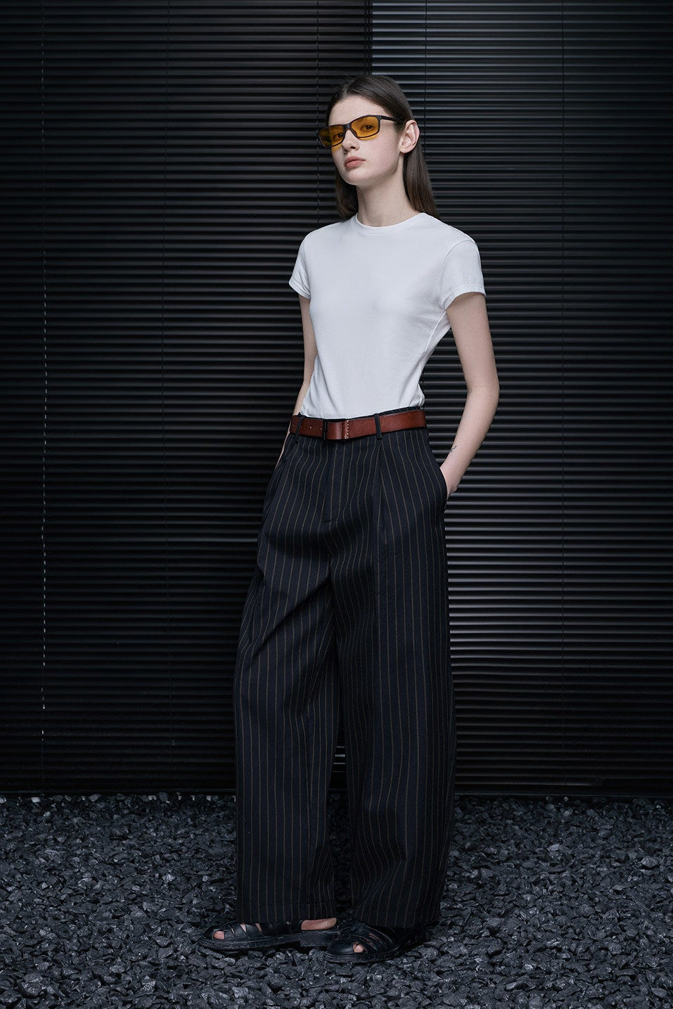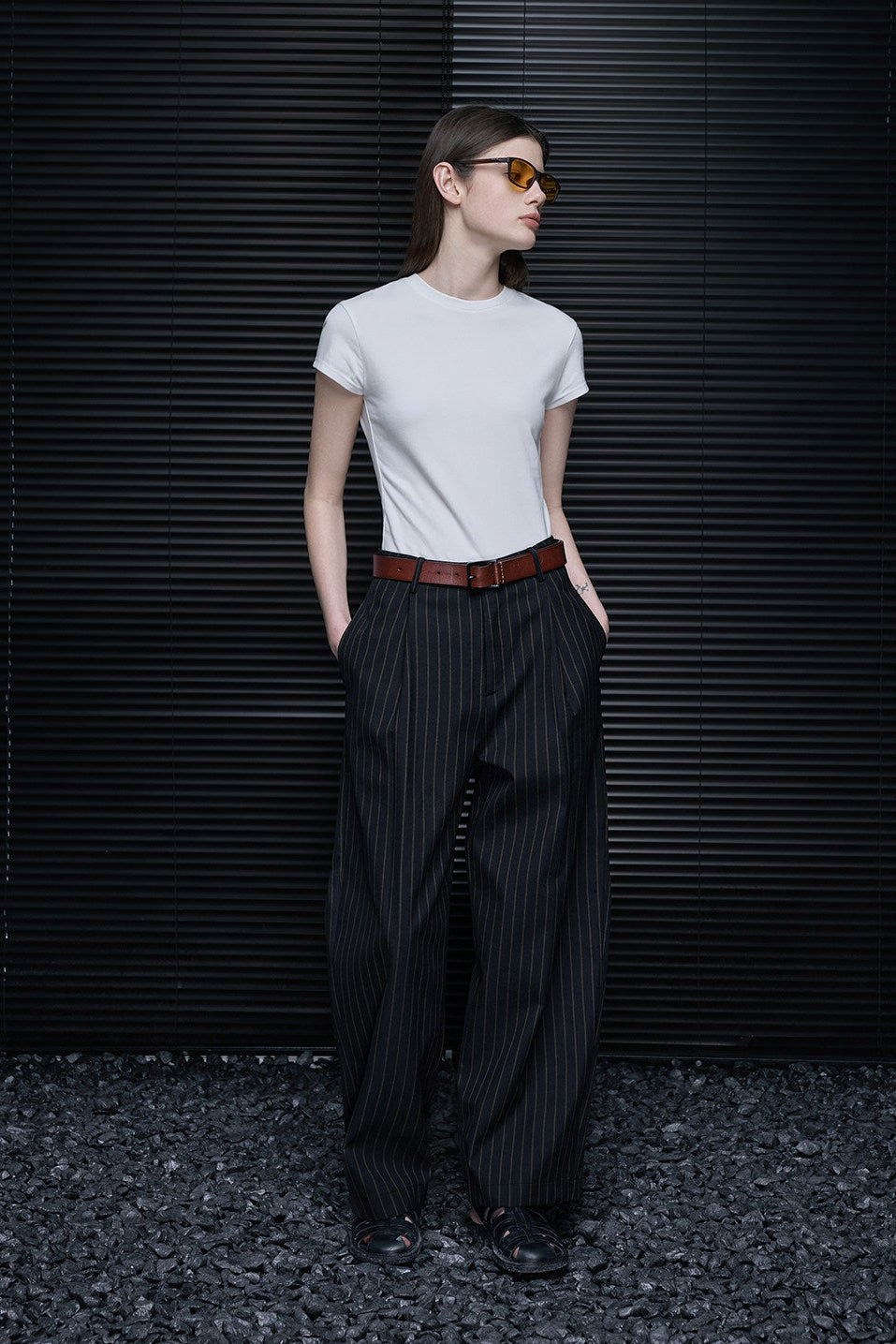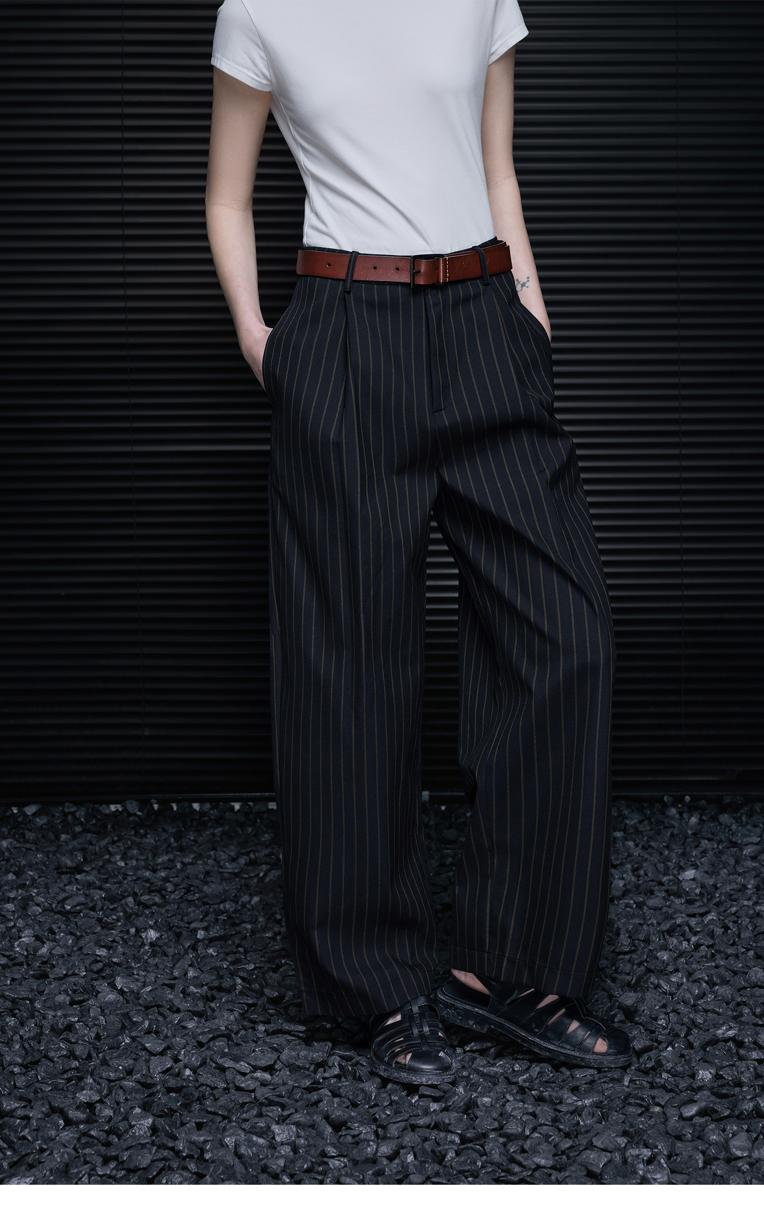 ハイウエストのダブルプリーツワイドパンツは、脚のラインを効果的に長く見せ