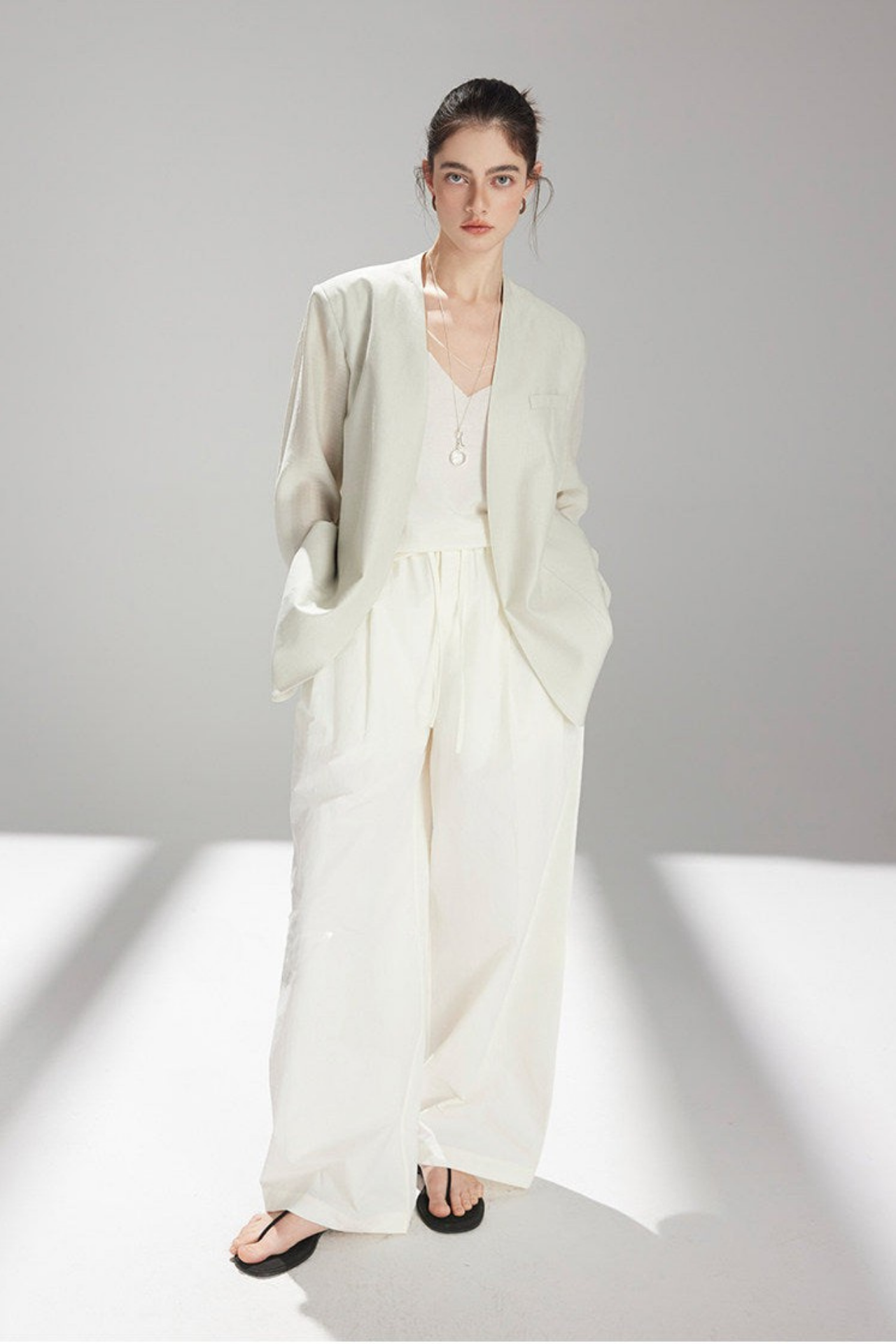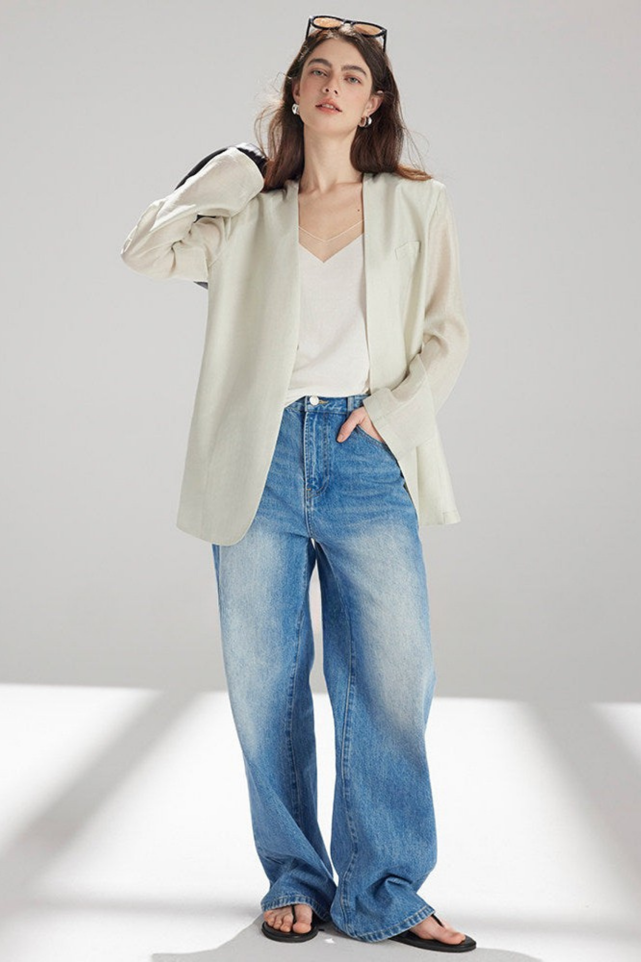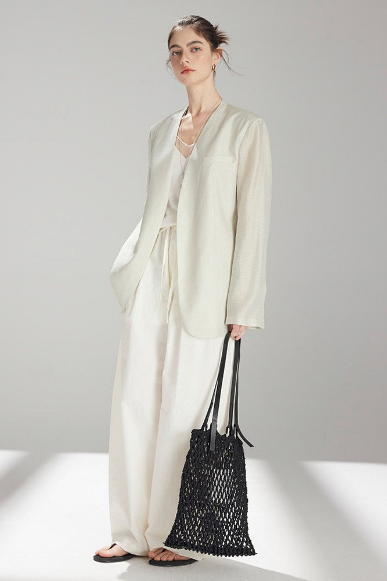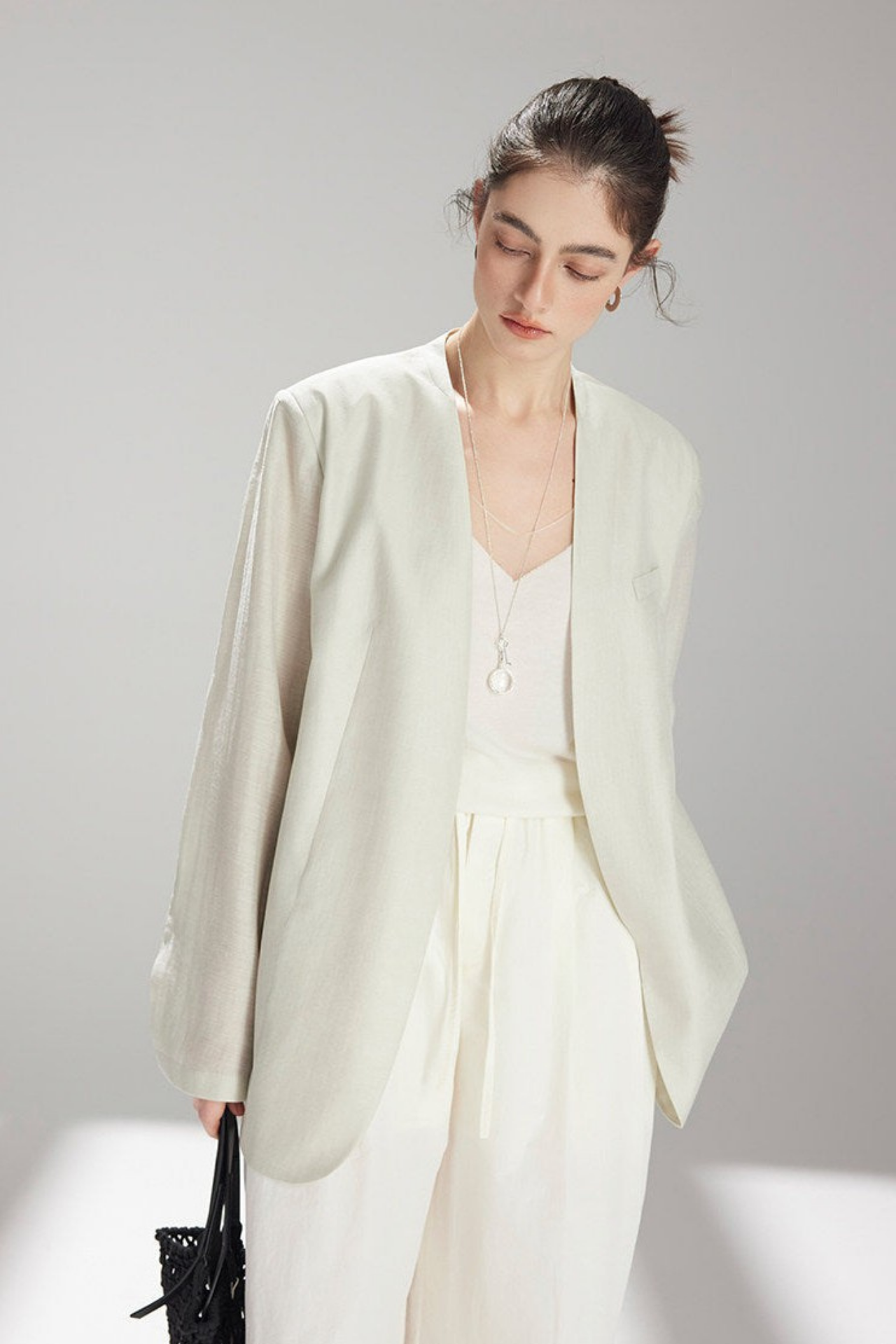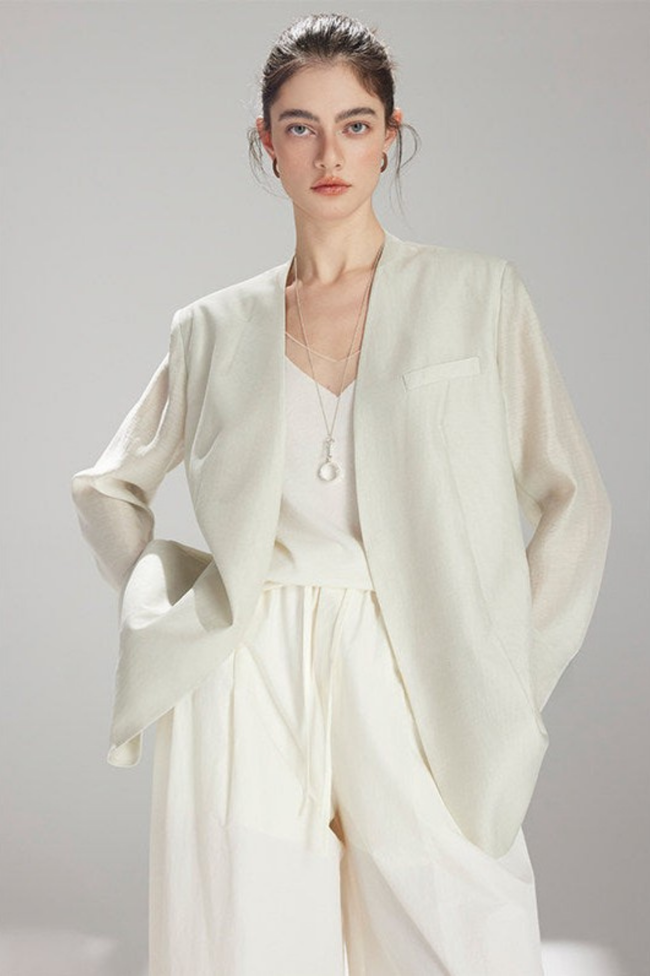 すっきりとした襟なしのシンプルなジャケット、通勤に最適なシックで気負わない