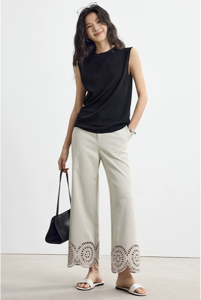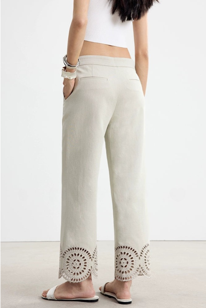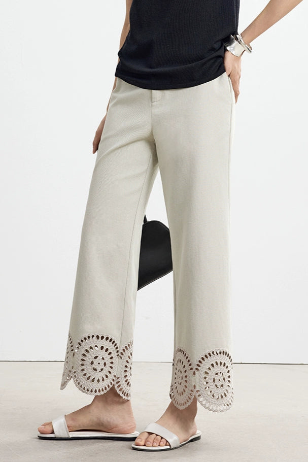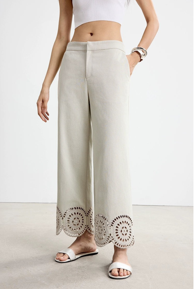 下擺鏤空刺繡直筒七分褲 B4142