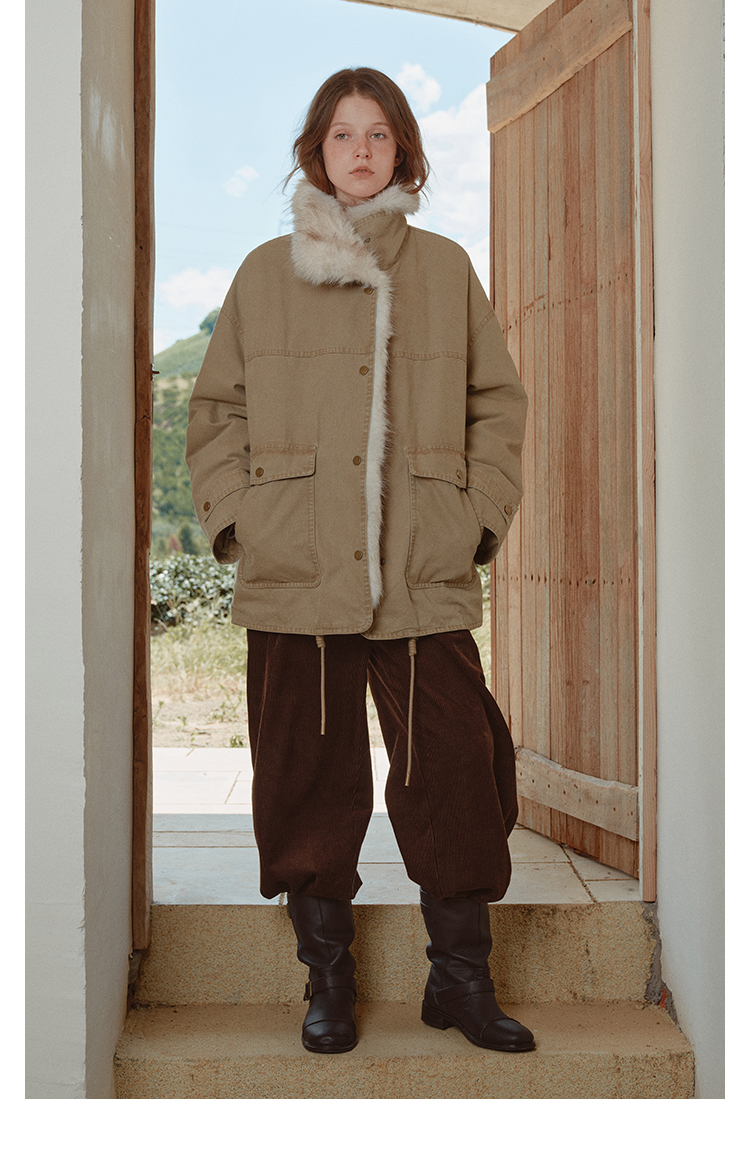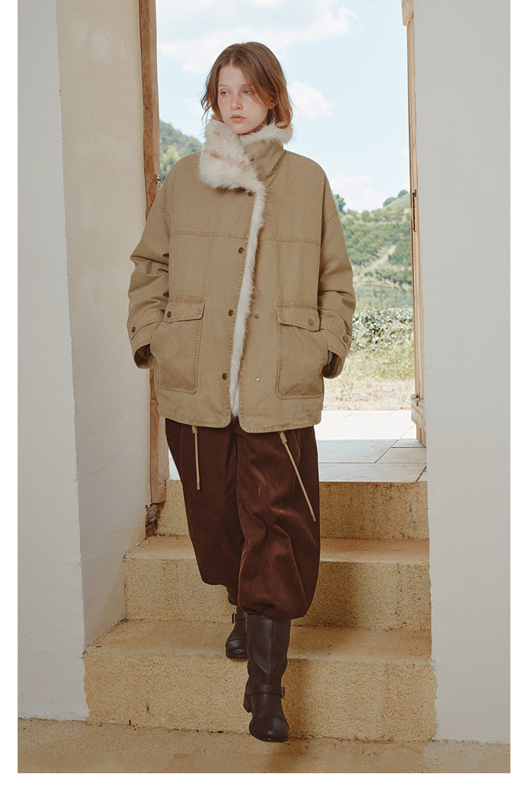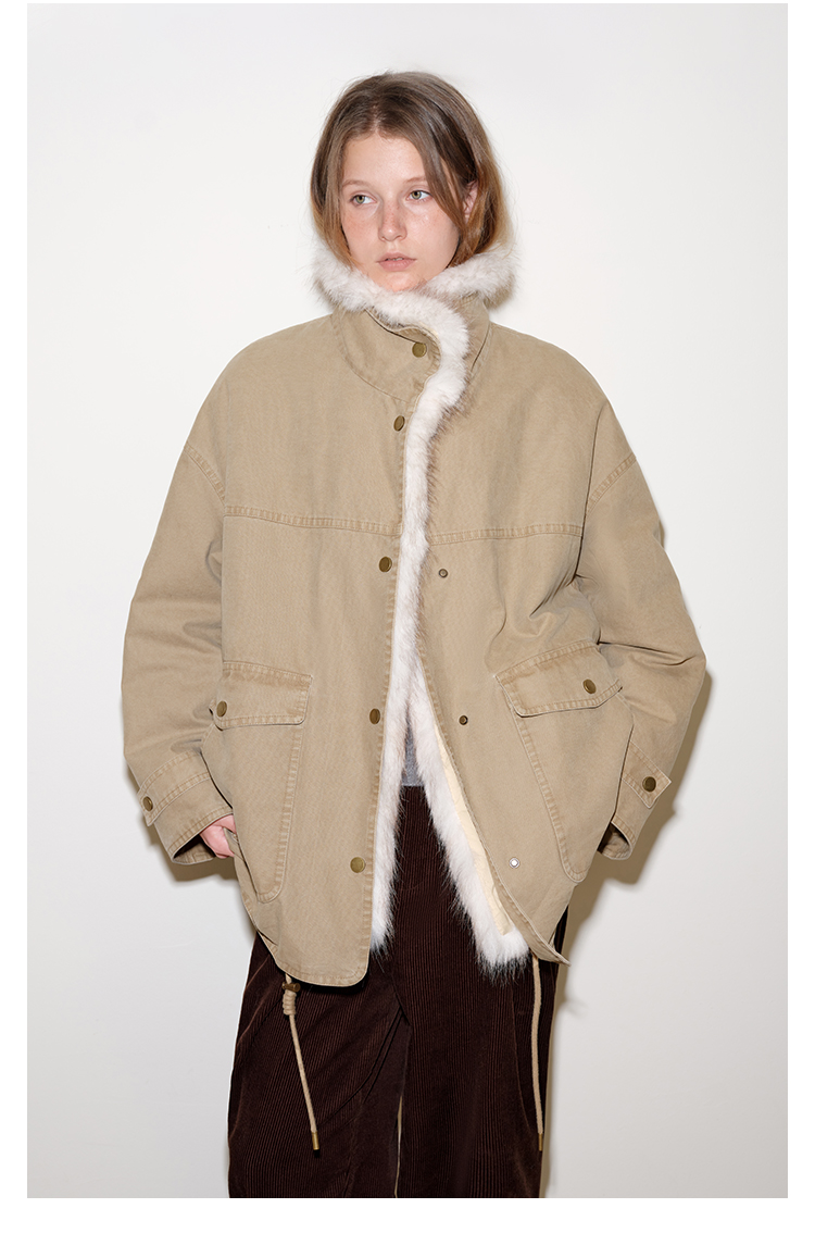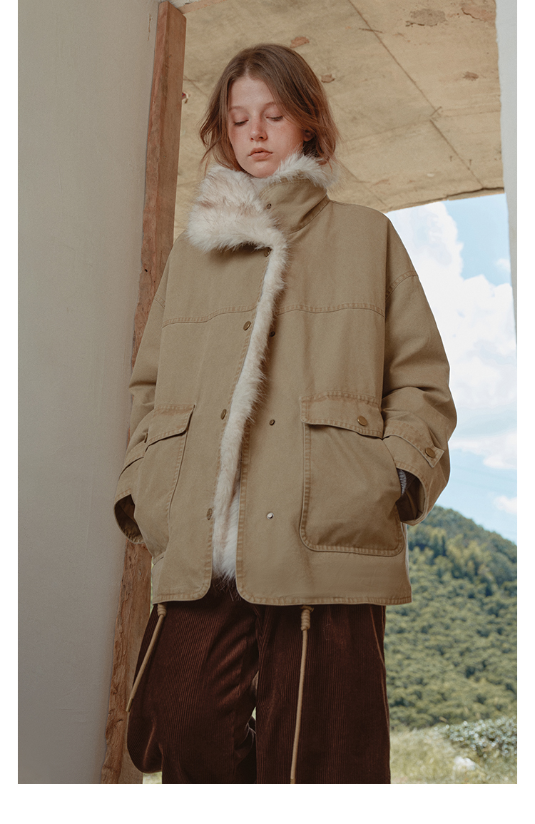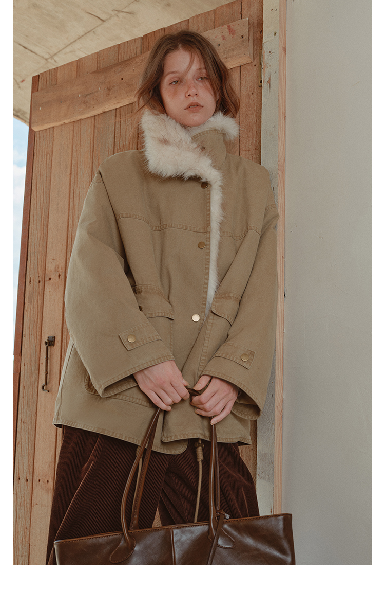 雙向領子內襯溫暖的人造毛皮,可實現多種多樣的造型。