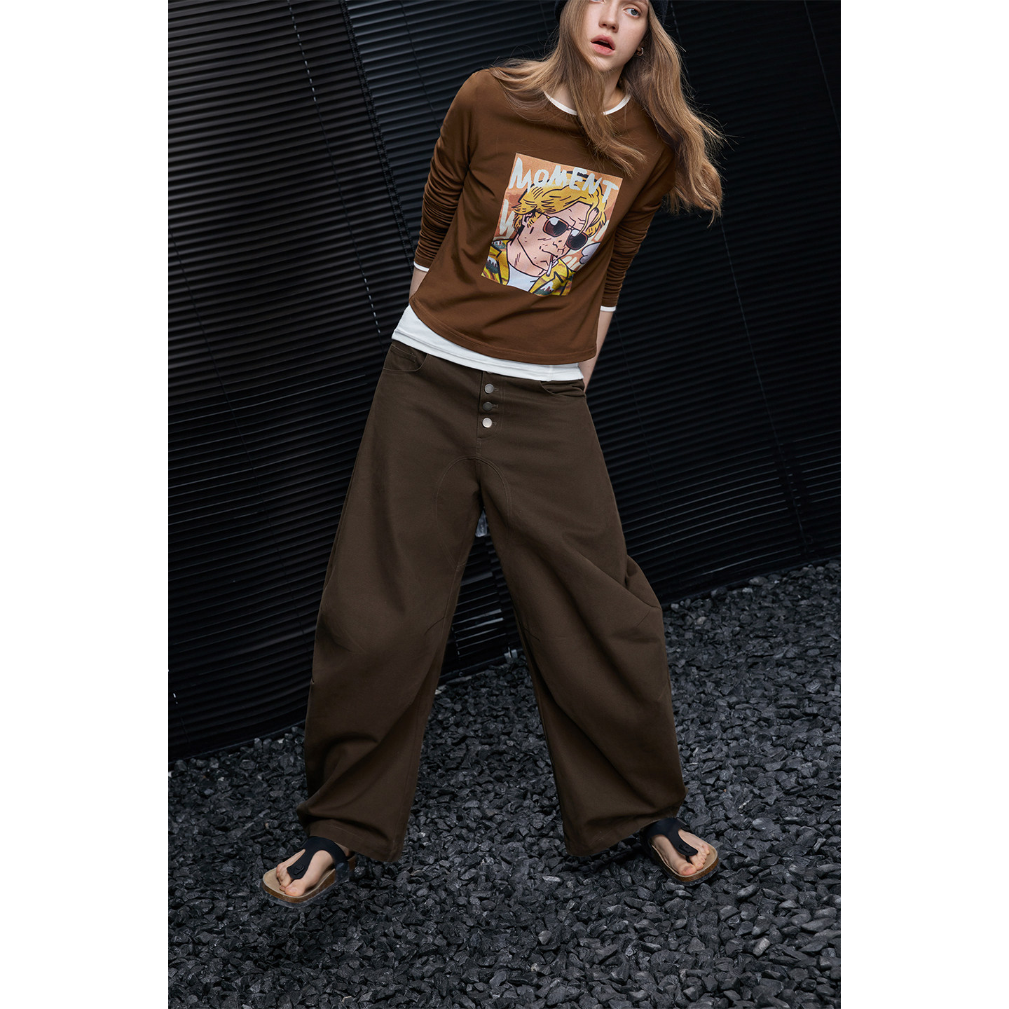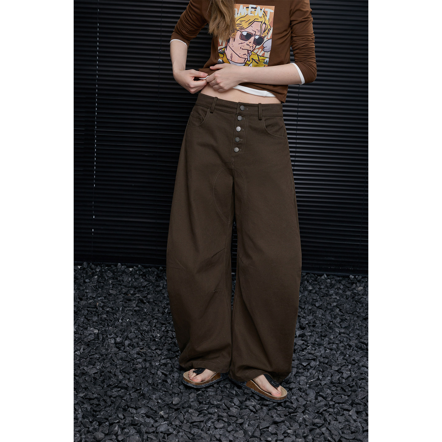 這款闊腿褲線條流暢,立體感強,正面飾有復古金屬扣環。