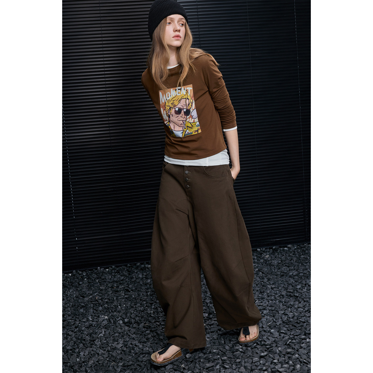 棕色棉質彎刀寬褲 B4606