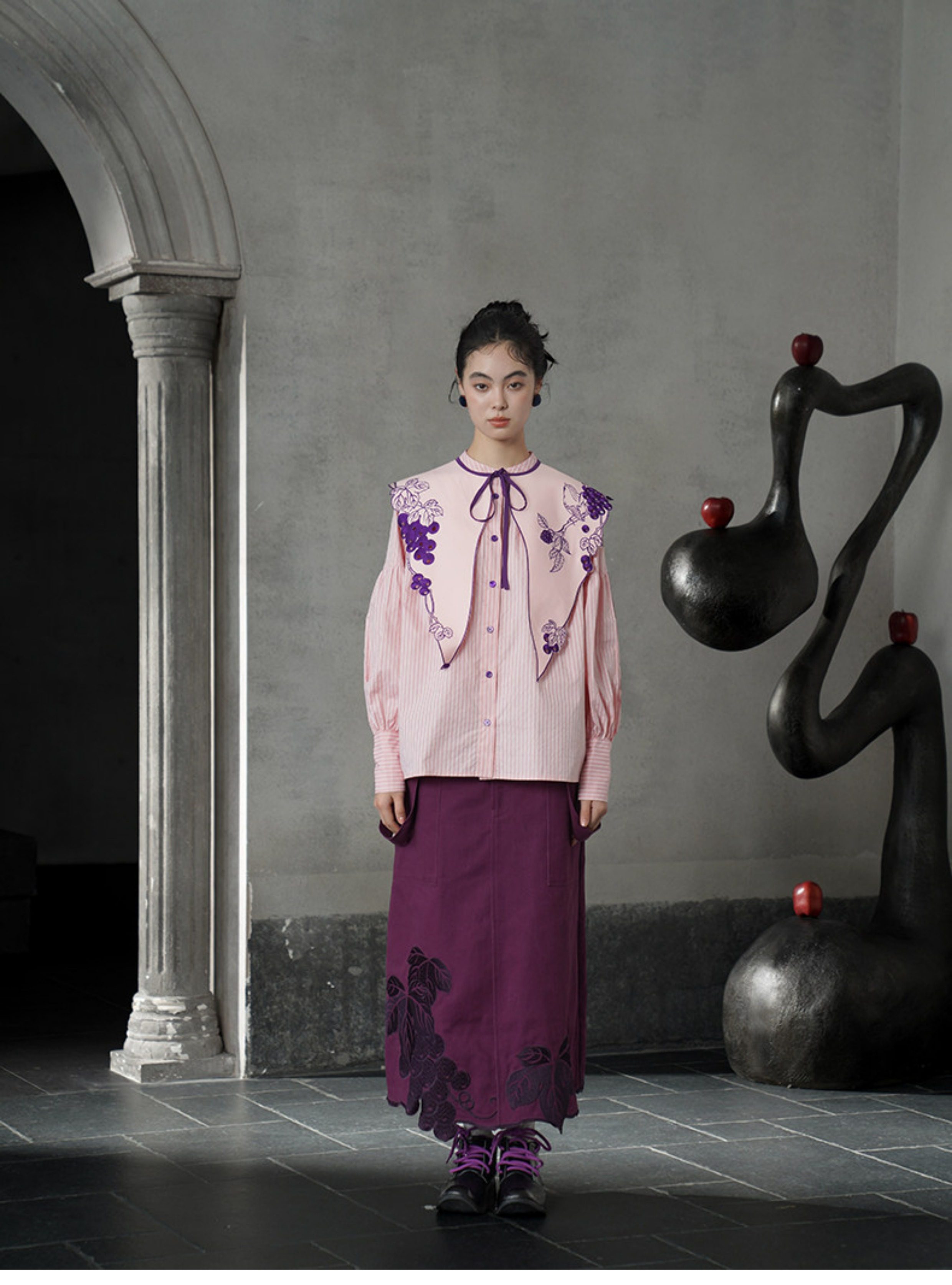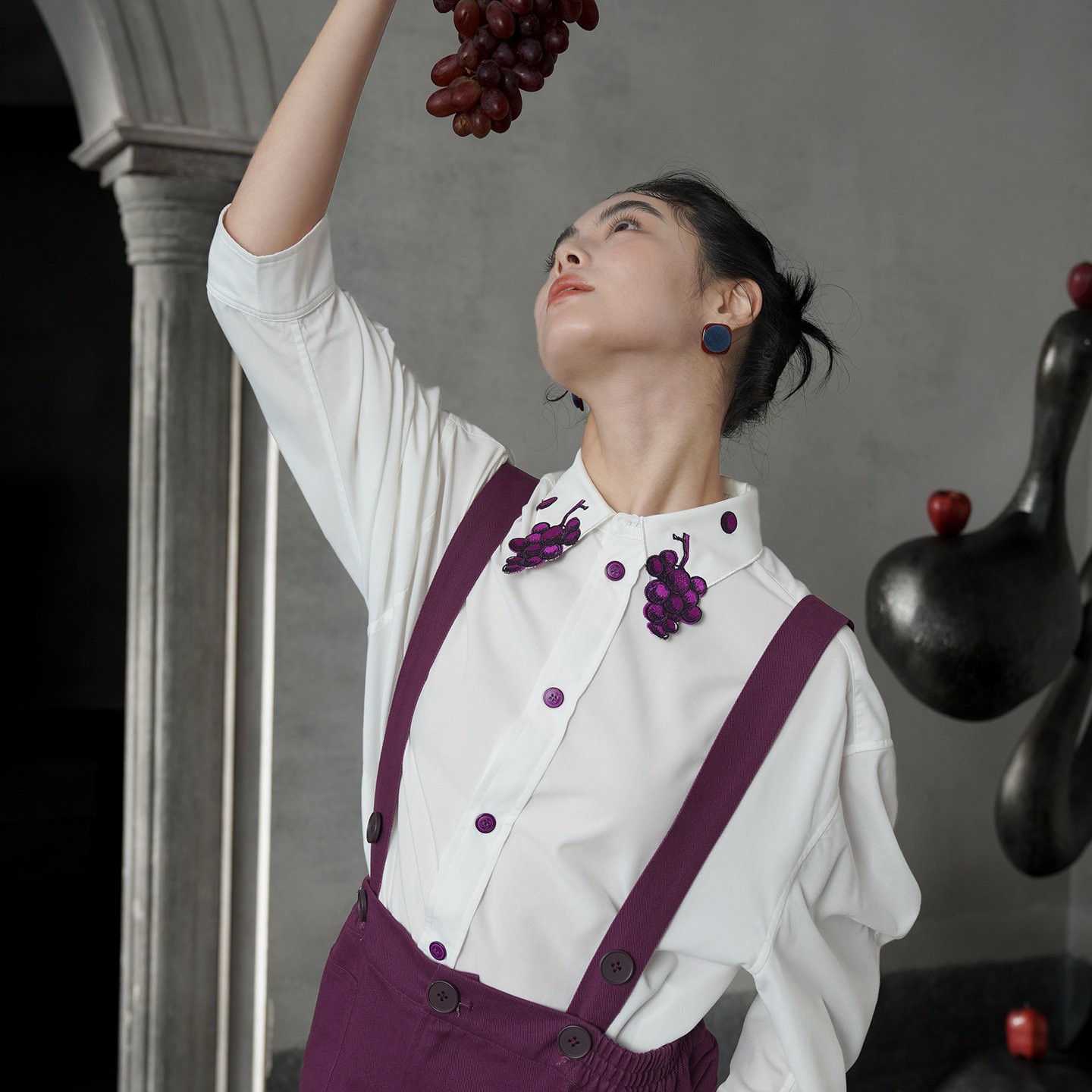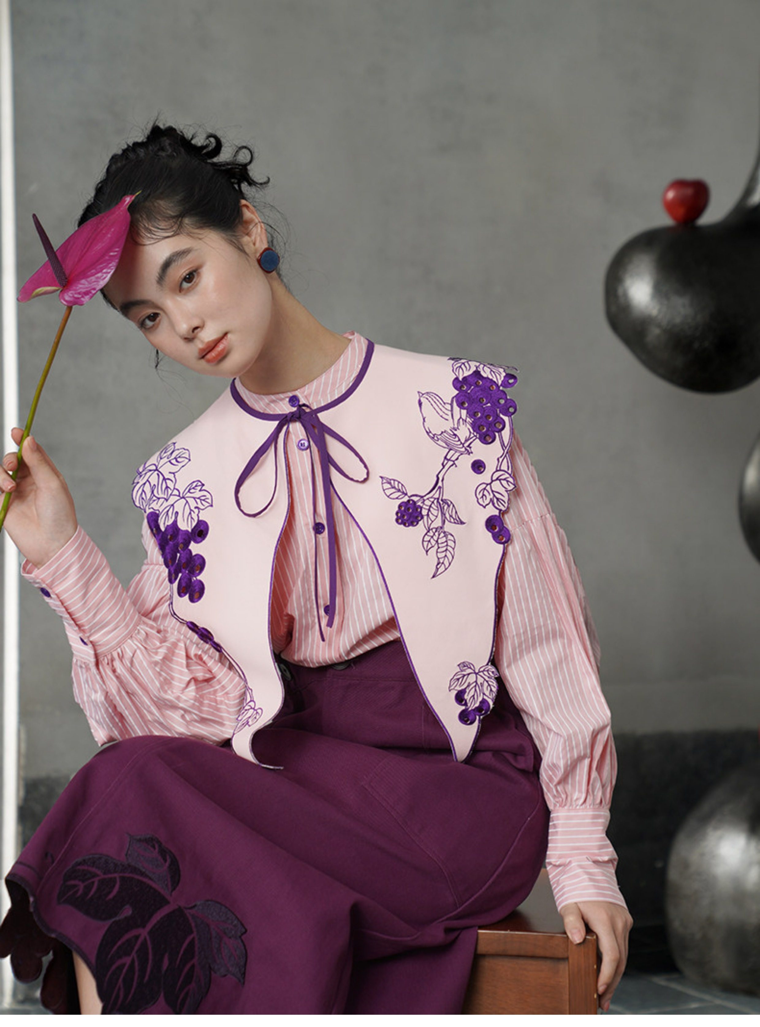 繡著的葡萄和紫色牡丹看起來像是沾滿了晨露的紫色果實。