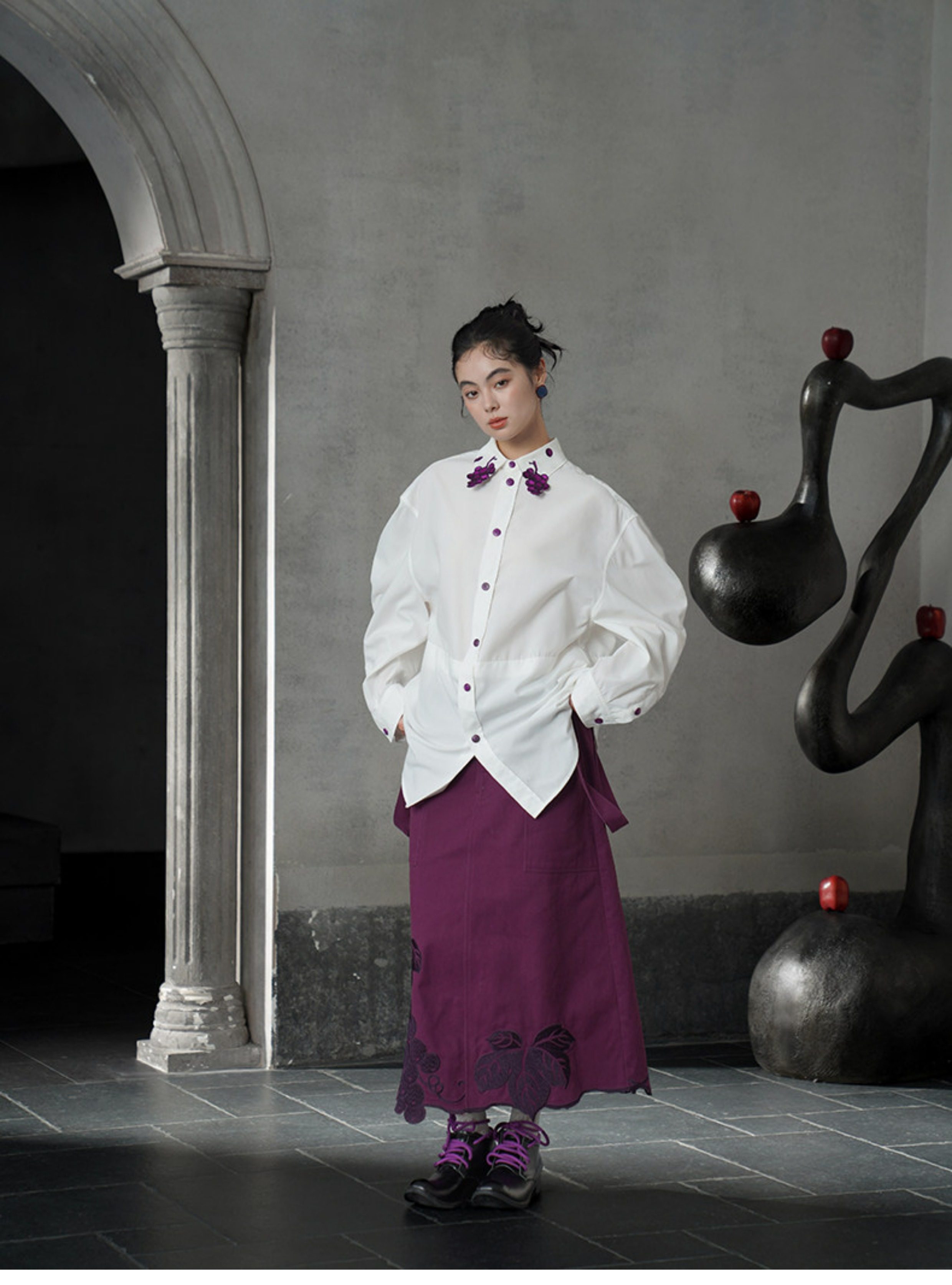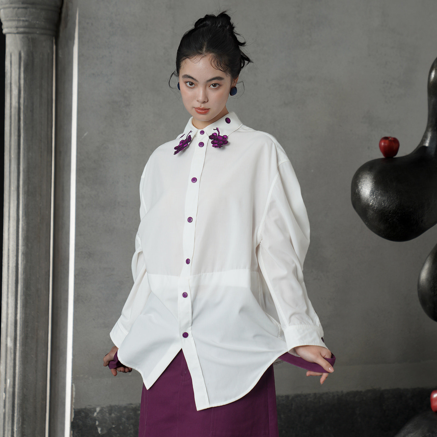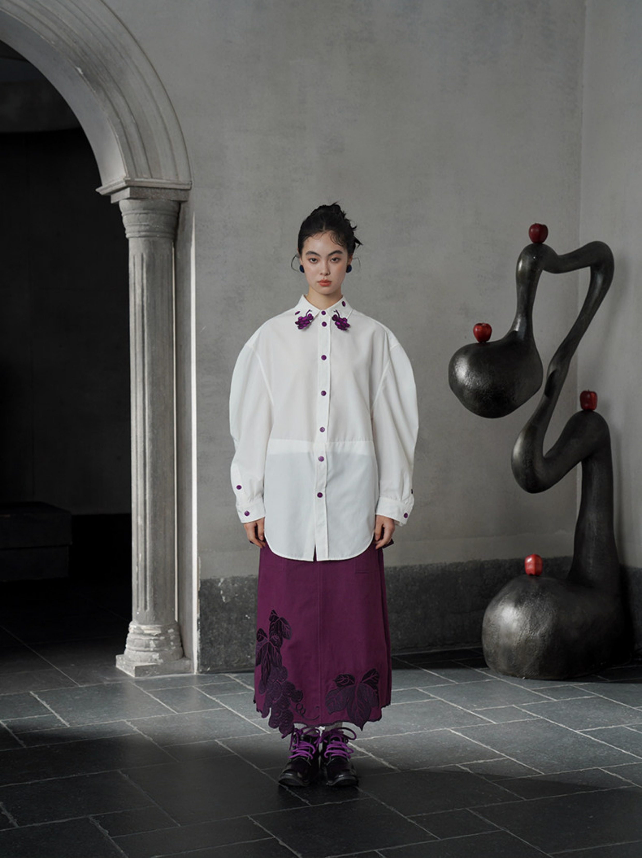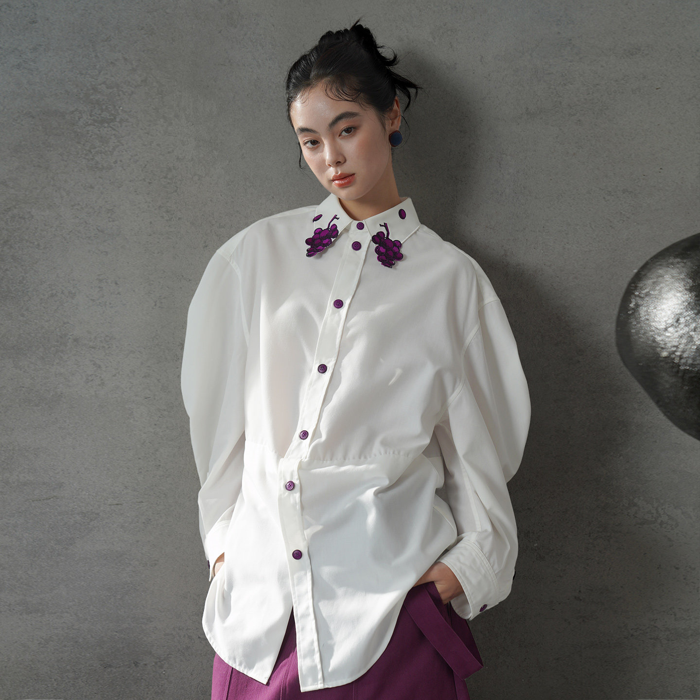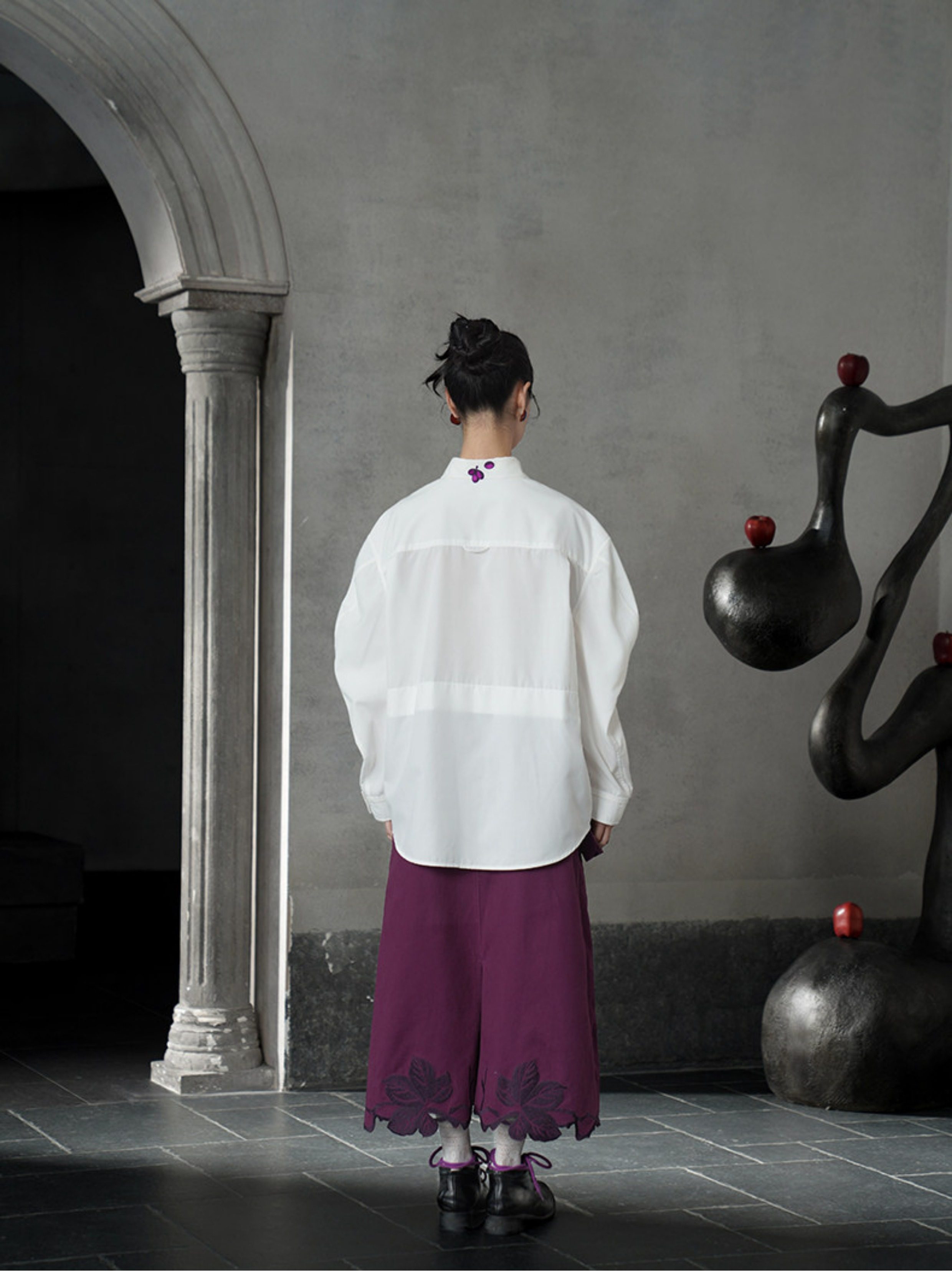 葡萄紫刺繡白襯衫 B4617