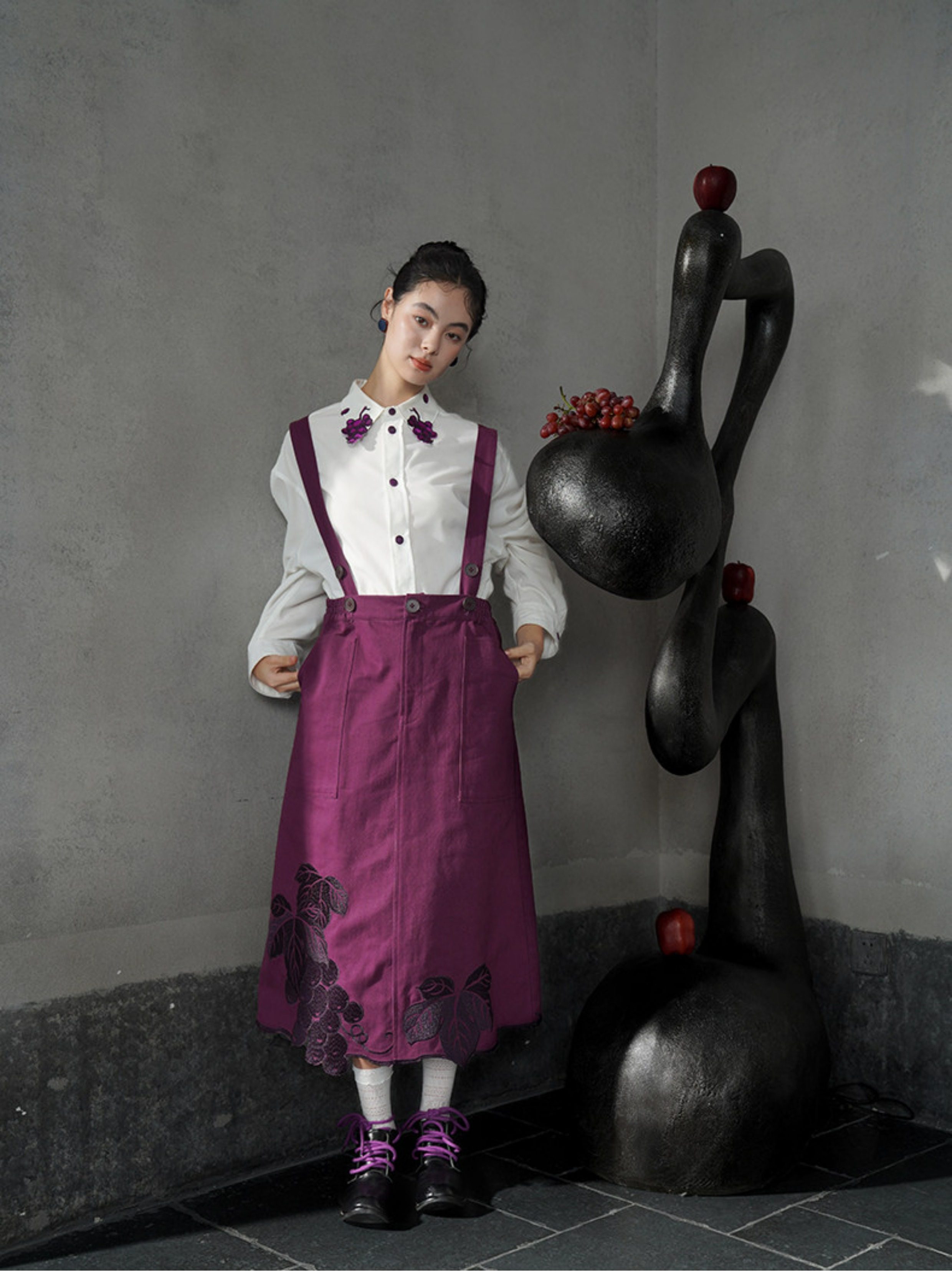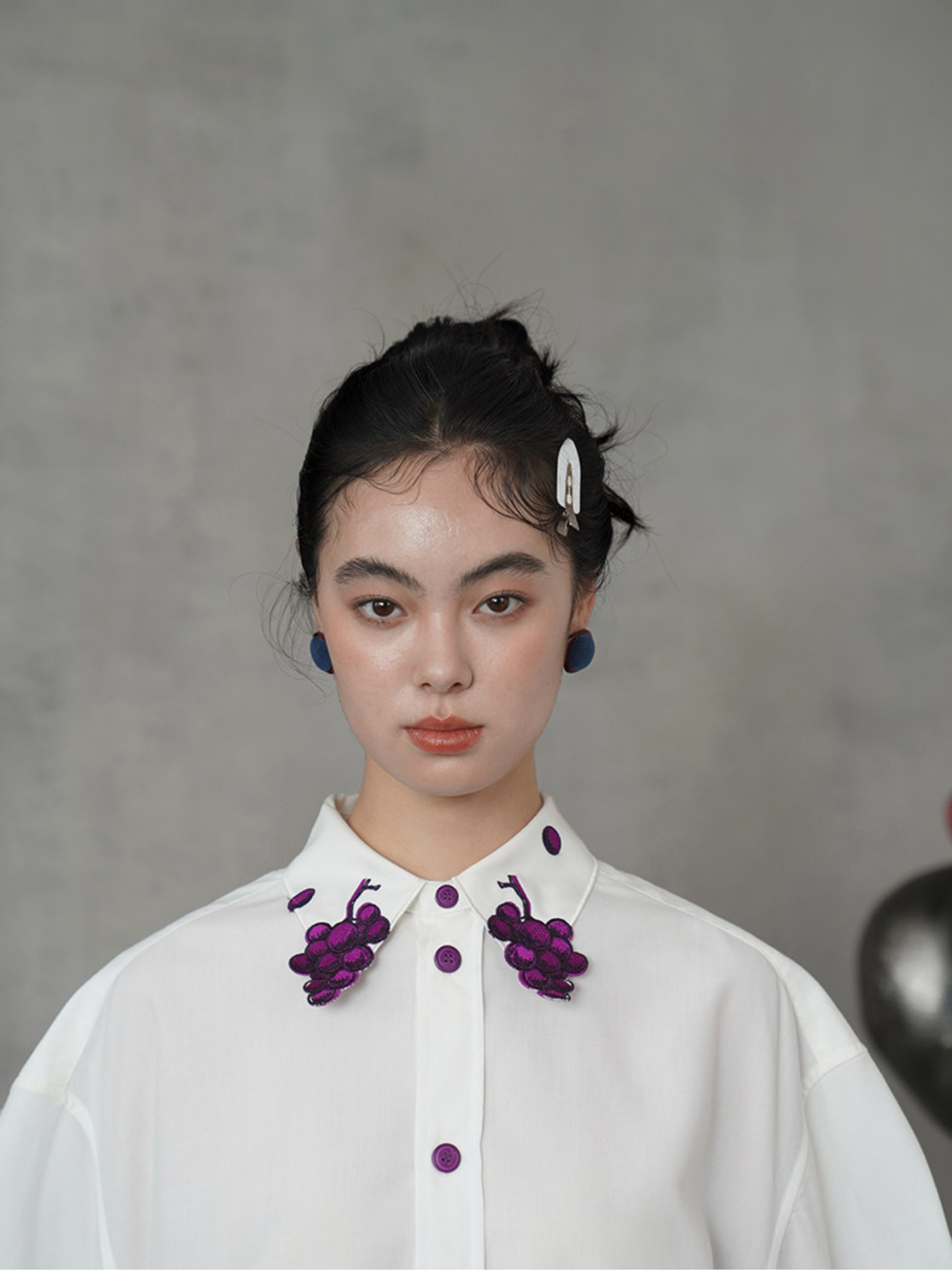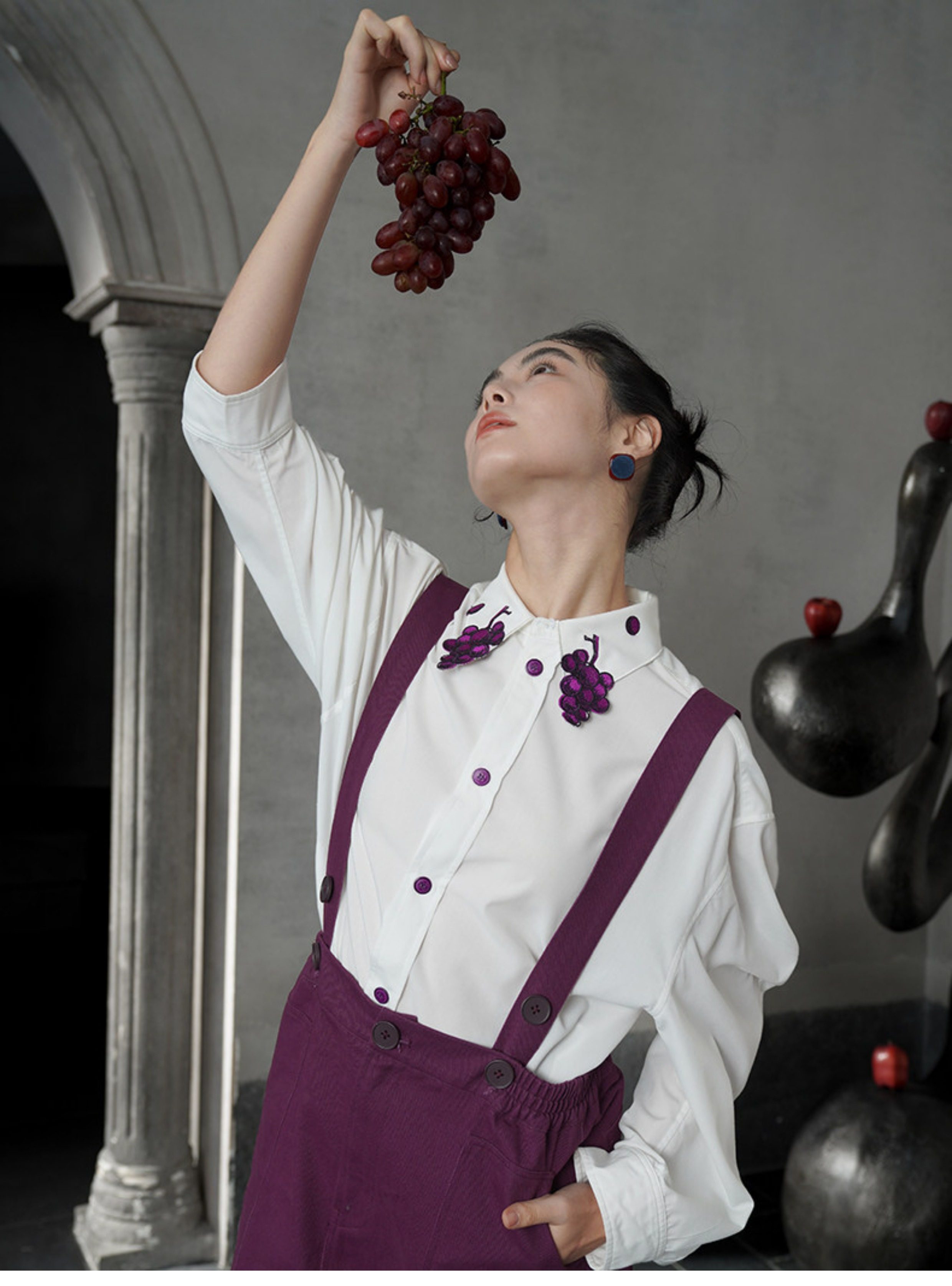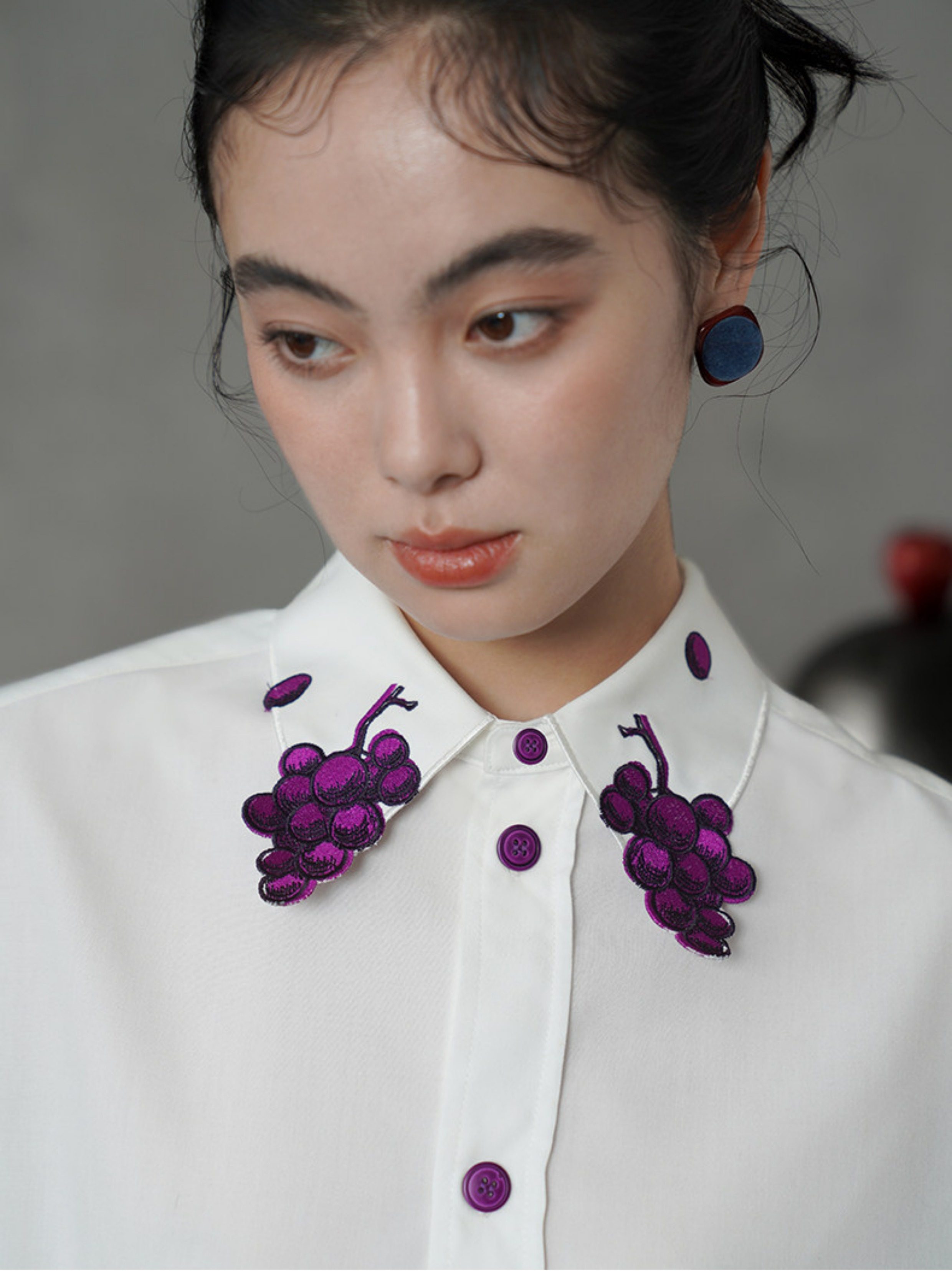 紫色的紐扣形狀似葡萄,由各種紫色絲線對稱刺繡而成,是這件衣服的亮點。