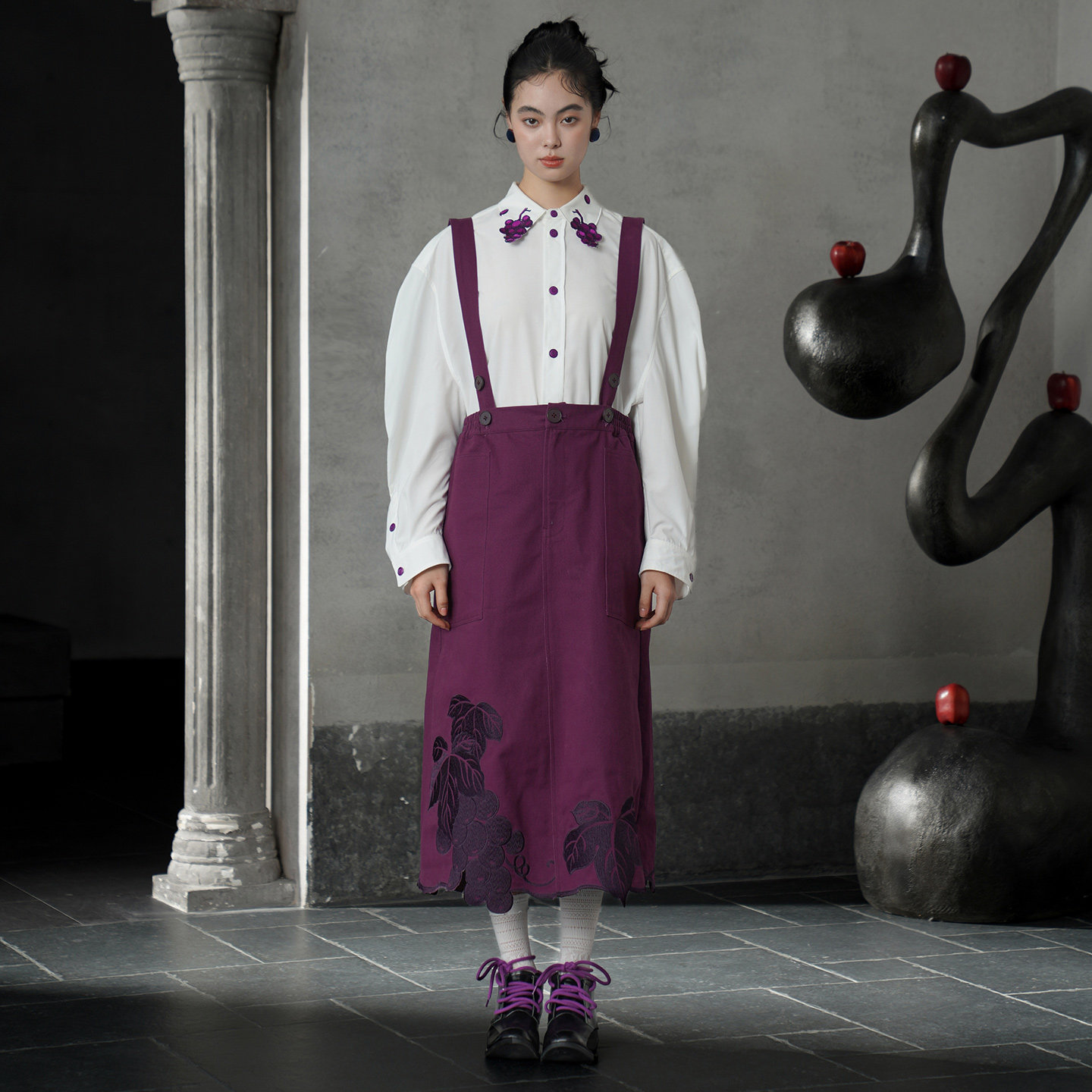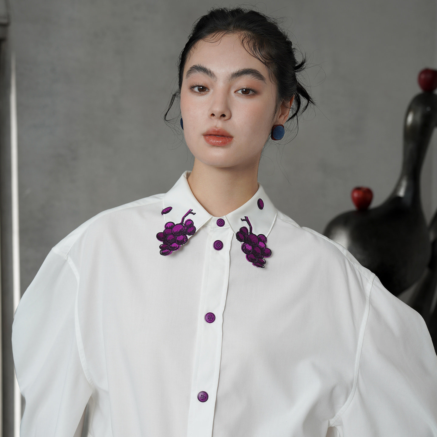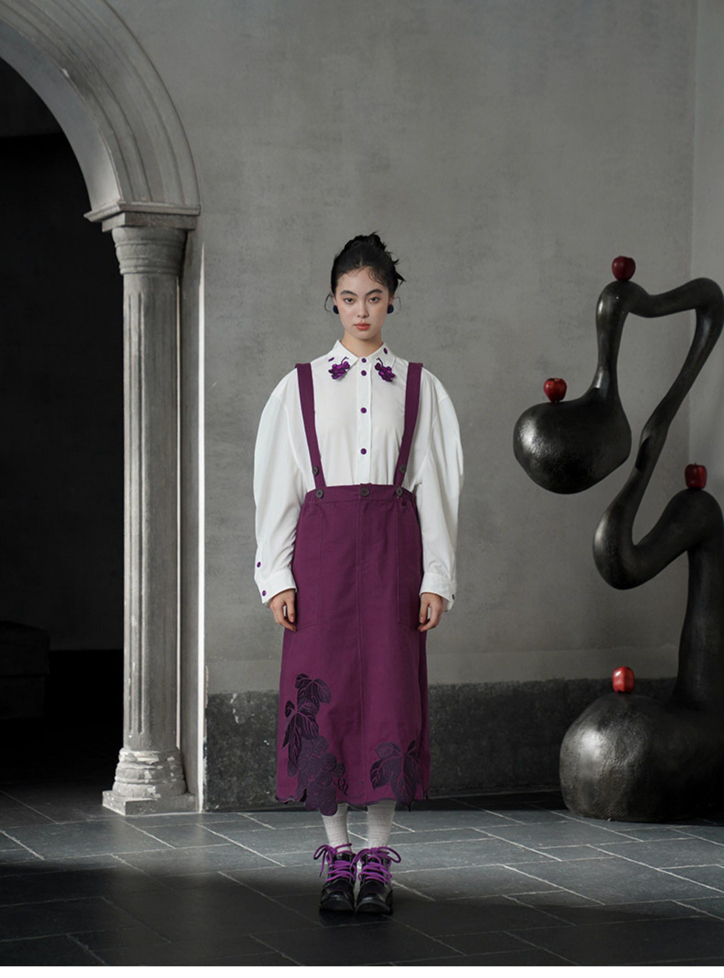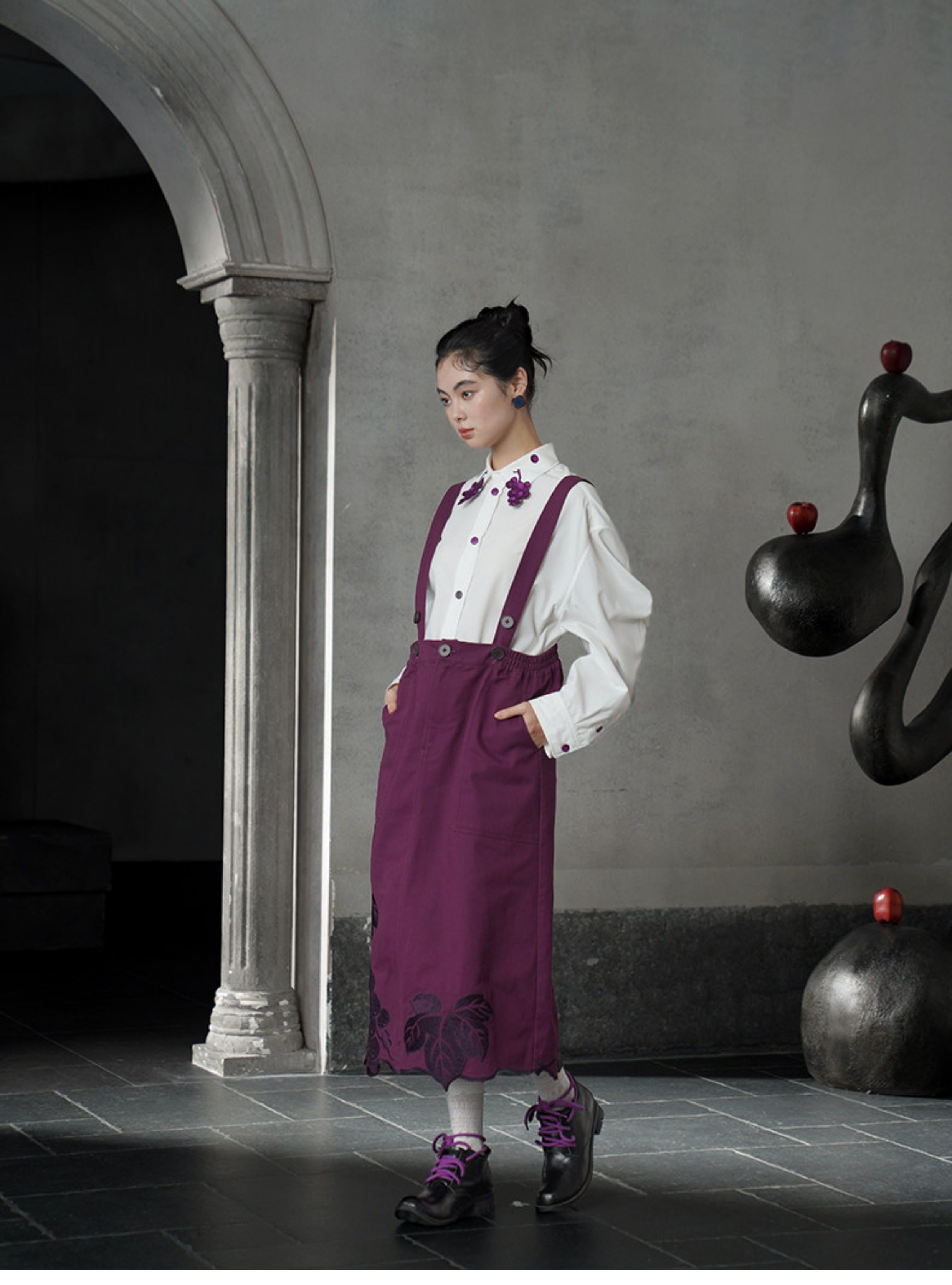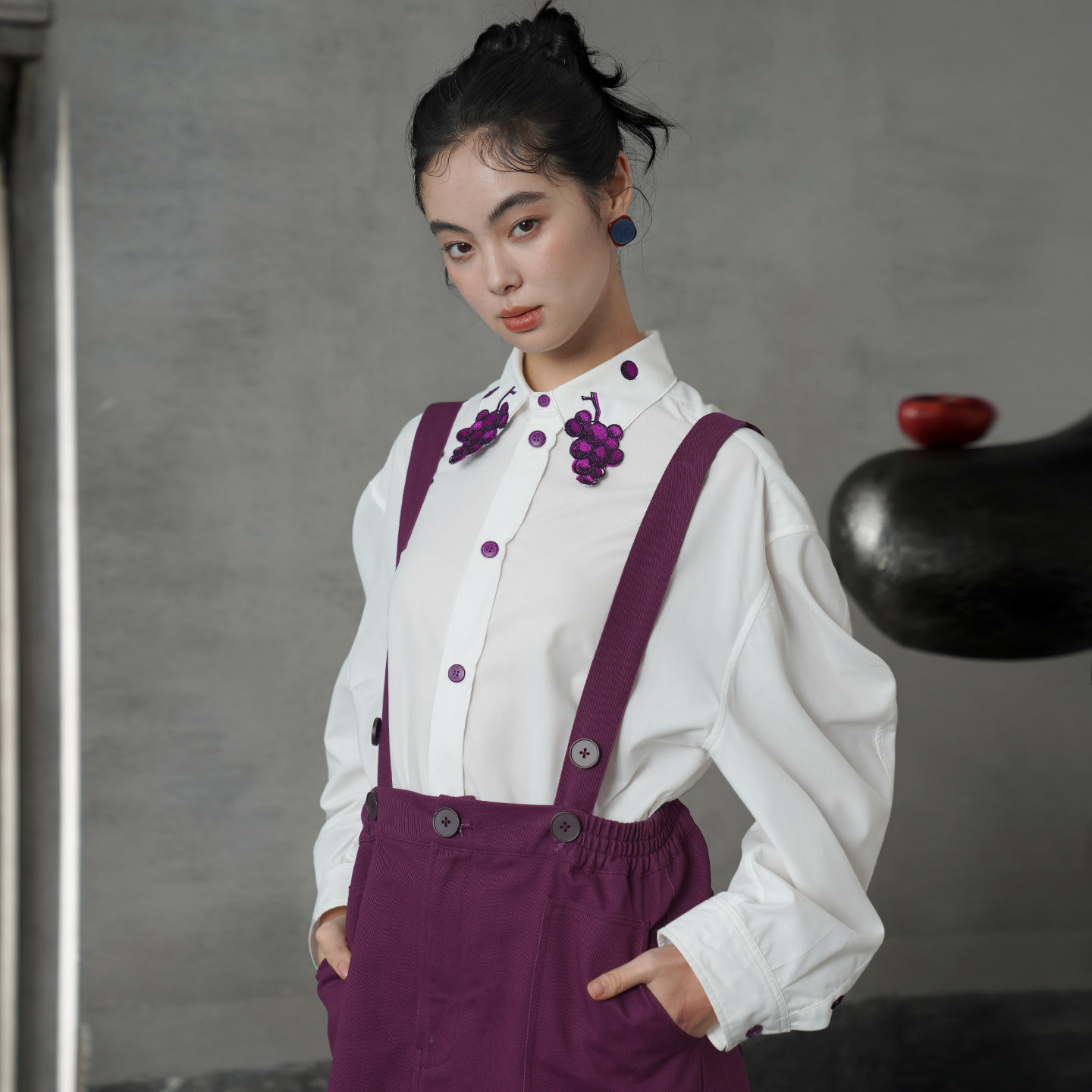 紫色的紐扣形狀似葡萄,由各種紫色絲線對稱刺繡而成,是這件衣服的亮點。